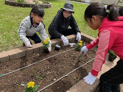 礼宝園と学校前花壇に全校8名で花を植えてきました。