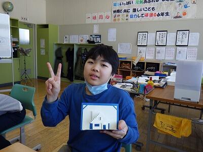 今回、切り込みを入れた一枚の紙(平面)が三角屋根の家(立体)になる不思議さやこうした方法が